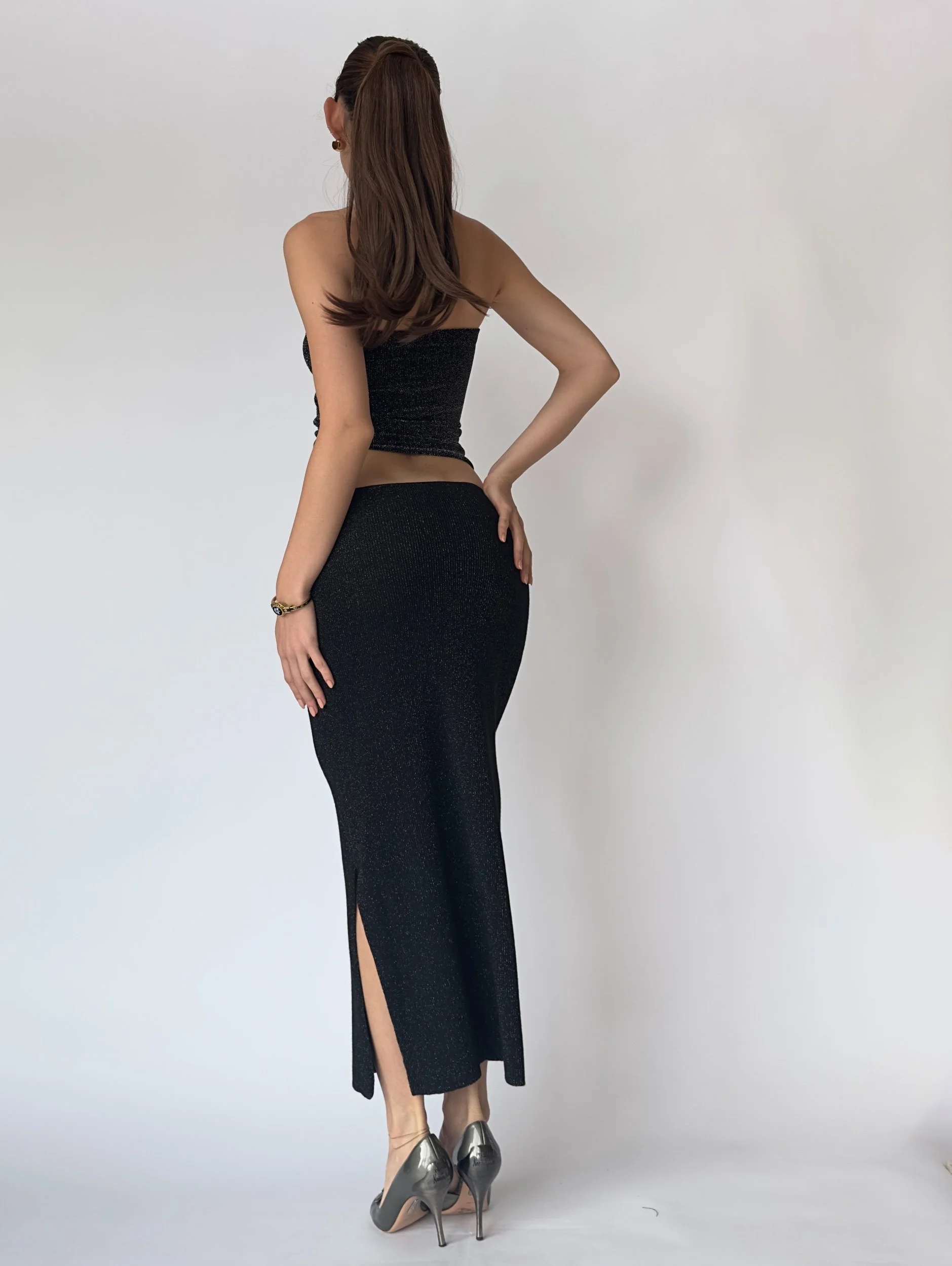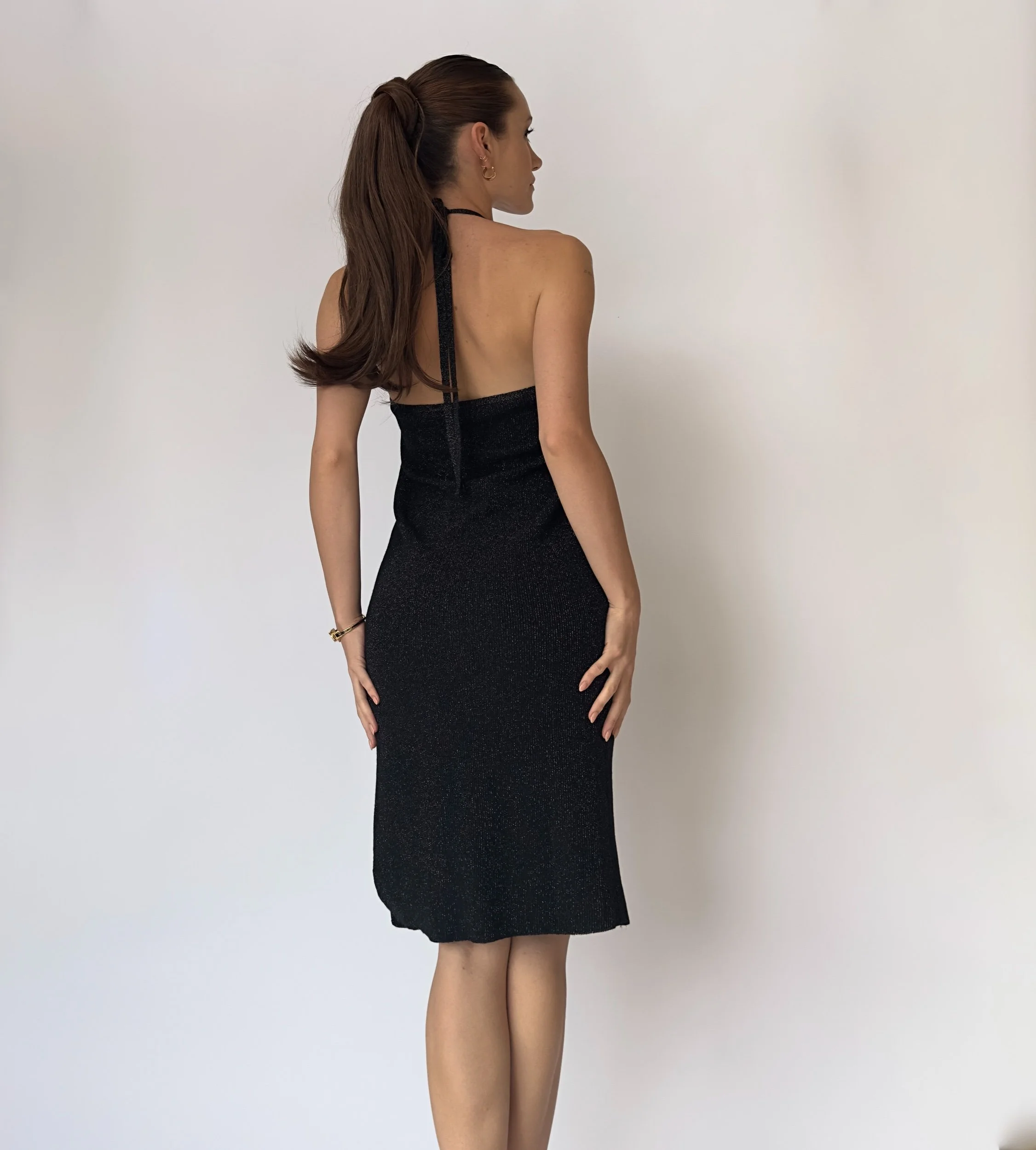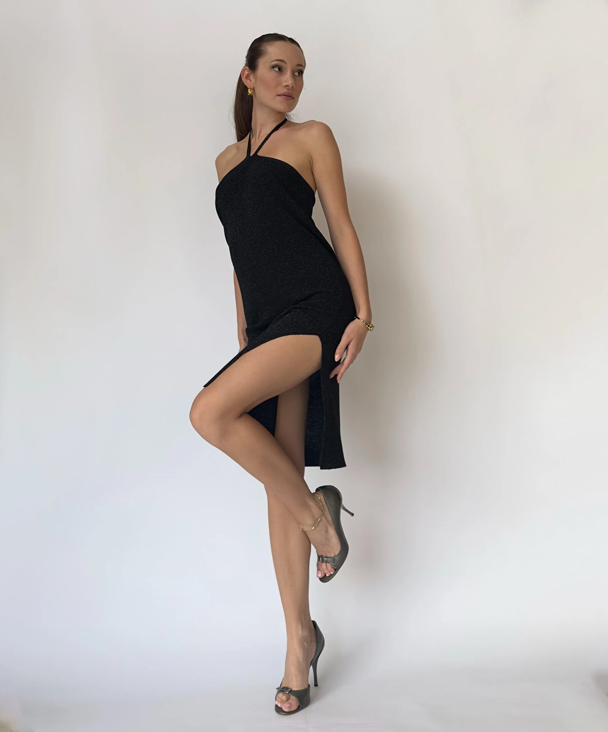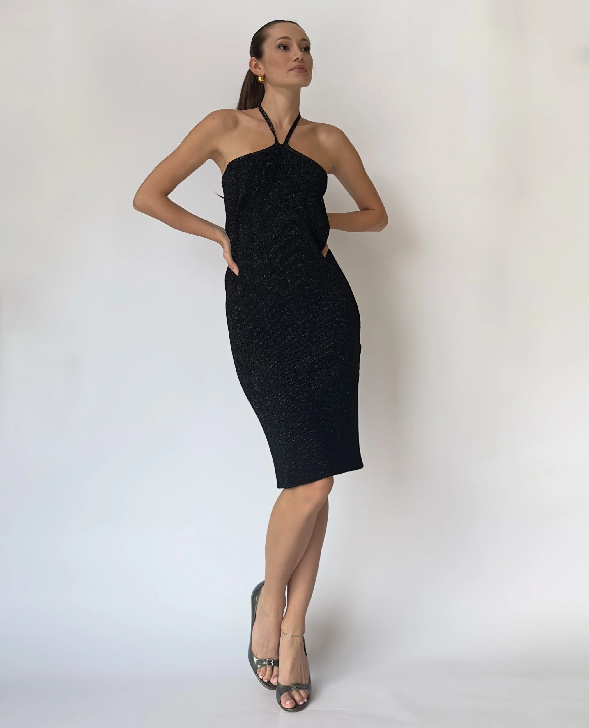 Lucy Paris black sequin halter dress that also doubles as a skirt. Features an adjustable halter strap. Lightly glittered fabric and a side slit.
