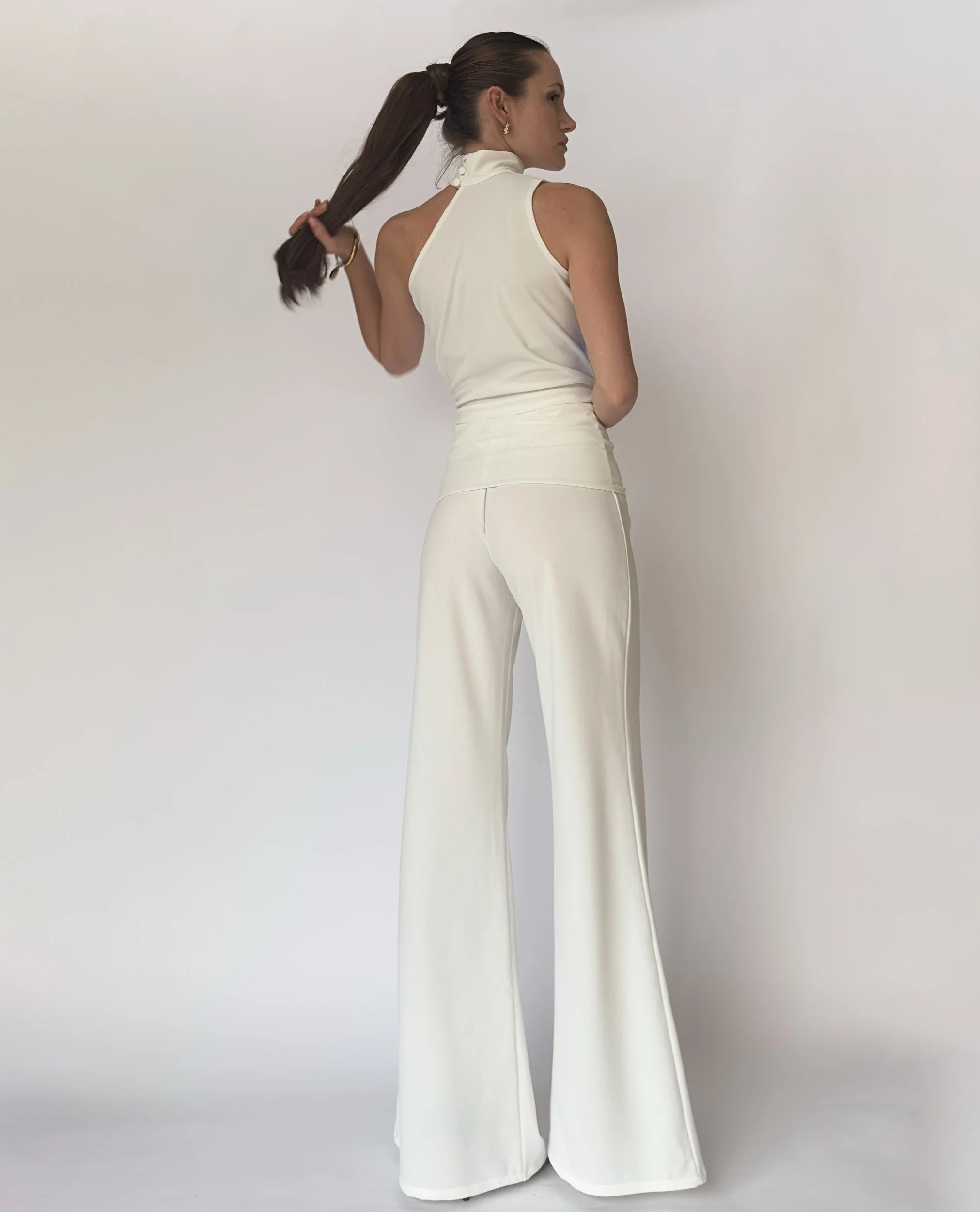 Bombon Spain, made in Spain. Jota white trousers with a waist attachment that is detachable and adjustable. Stretch fabric with an elastic waist band.